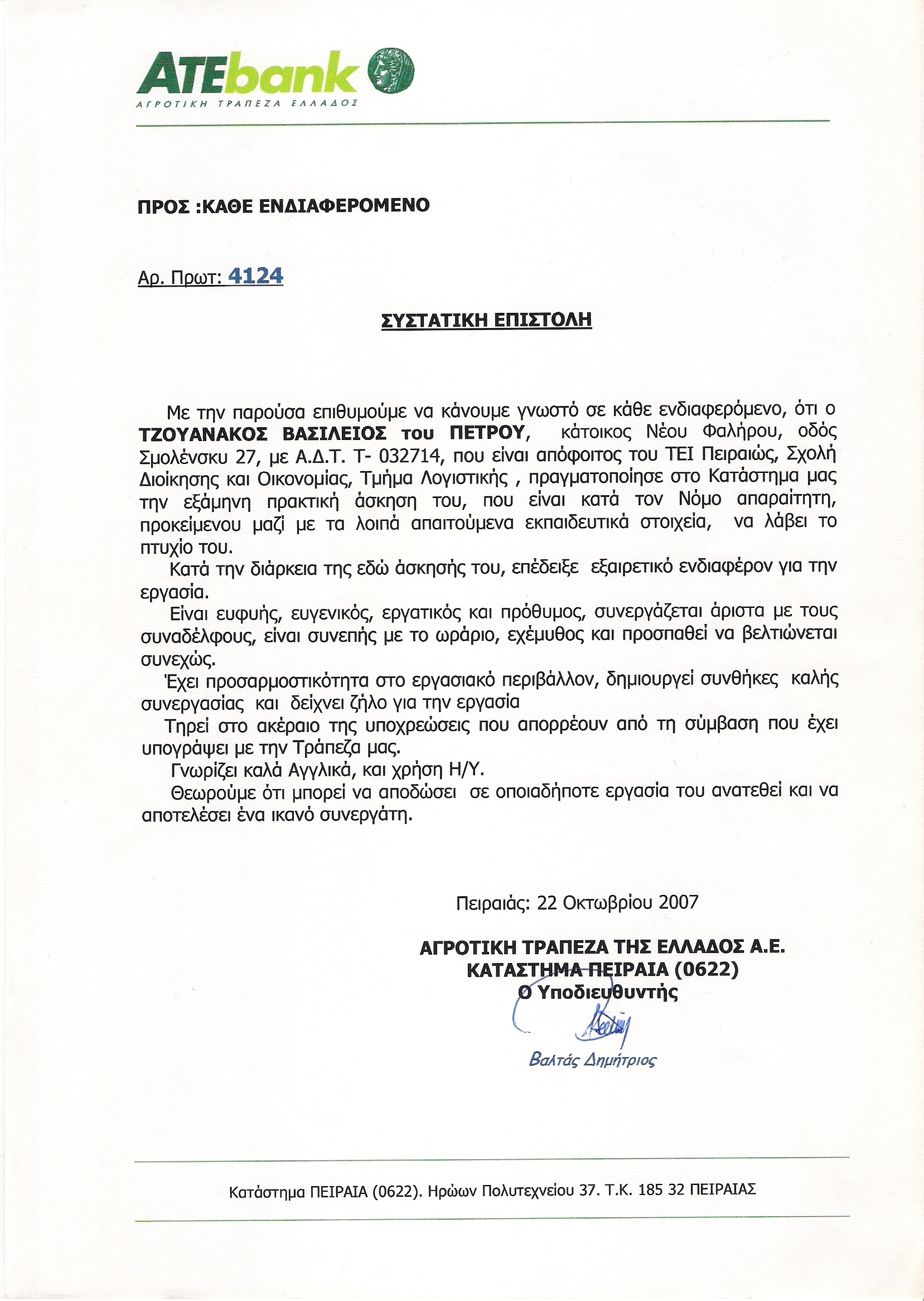 Εργάζομαι από το 2012 μέχρι σήμερα στην Cosmote e-Value ως ιδιωτικός υπάλληλος στην Αθήνα. Πραγματοποίησα την πρακτική μου άσκηση για τη λήψη πτυχίου στην Αγροτική Τράπεζα της Ελλάδας, υποκατάστημα Πειραιά το 2007. Στη συνέχεια, ολοκληρώνοντας την παρακολούθησή μου στο πρόγραμμα ήμουν ασκούμενος στο Γενικό Νοσοκομείο Πειραιά << ΤΖΑΝΕΙΟ >> το 2010. Ως ελεύθερος επαγγελματίας το 2011 συνεργάστηκα με το λογιστικό γραφείο της Σοφίας Χατζηιωαννίδου στο Νέο Φάληρο. Εκπόνησα μαζί με το συνάδελφο Παντελή Γραμματικόπουλο το 2007 υπό την καθοδήγηση της καθηγήτριας Αικατερίνης Λεκαράκου την πτυχιακή εργασία << ΑΝΑΛΥΣΗ ΤΩΝ ΠΕΝΤΕ ΤΕΛΕΥΤΑΙΩΝ ΙΣΟΛΟΓΙΣΜΩΝ ΤΟΥ ΞΕΝΟΔΟΧΕΙΟΥ "SAVOY" >> η οποία δημοσιεύτηκε στο https://eudoxus.gr Επιπρόσθετα από το 2010 έως το 2011 υπό την επίβλεψη της εκπαιδεύτριας Ελένης Ζαμπέλη ασχολήθηκα με τη μελέτη δύο θεμάτων: 1) << ΧΡΗΜΑΤΟΟΙΚΟΝΟΜΙΚΗ ΛΟΓΙΣΤΙΚΗ ΚΑΙ ΟΙ ΕΠΙΠΤΩΣΕΙΣ ΤΗΣ ΟΙΚΟΝΟΜΙΚΗΣ ΚΡΙΣΗΣ ΣΤΗΝ ΕΛΛΑΔΑ ΣΗΜΕΡΑ >> και 2) << ΤΟ ΒΑΘΥΤΕΡΟ ΝΟΗΜΑ ΤΩΝ ΧΡΙΣΤΟΥΓΕΝΝΩΝ ΠΟΙΟΣ Ο ΣΥΜΒΟΛΙΣΜΟΣ ΤΟΥΣ ΚΑΙ ΠΟΙΑ Η ΣΗΜΑΣΙΑ ΤΟΥΣ ΣΤΙΣ ΜΕΡΕΣ ΜΑΣ >>.